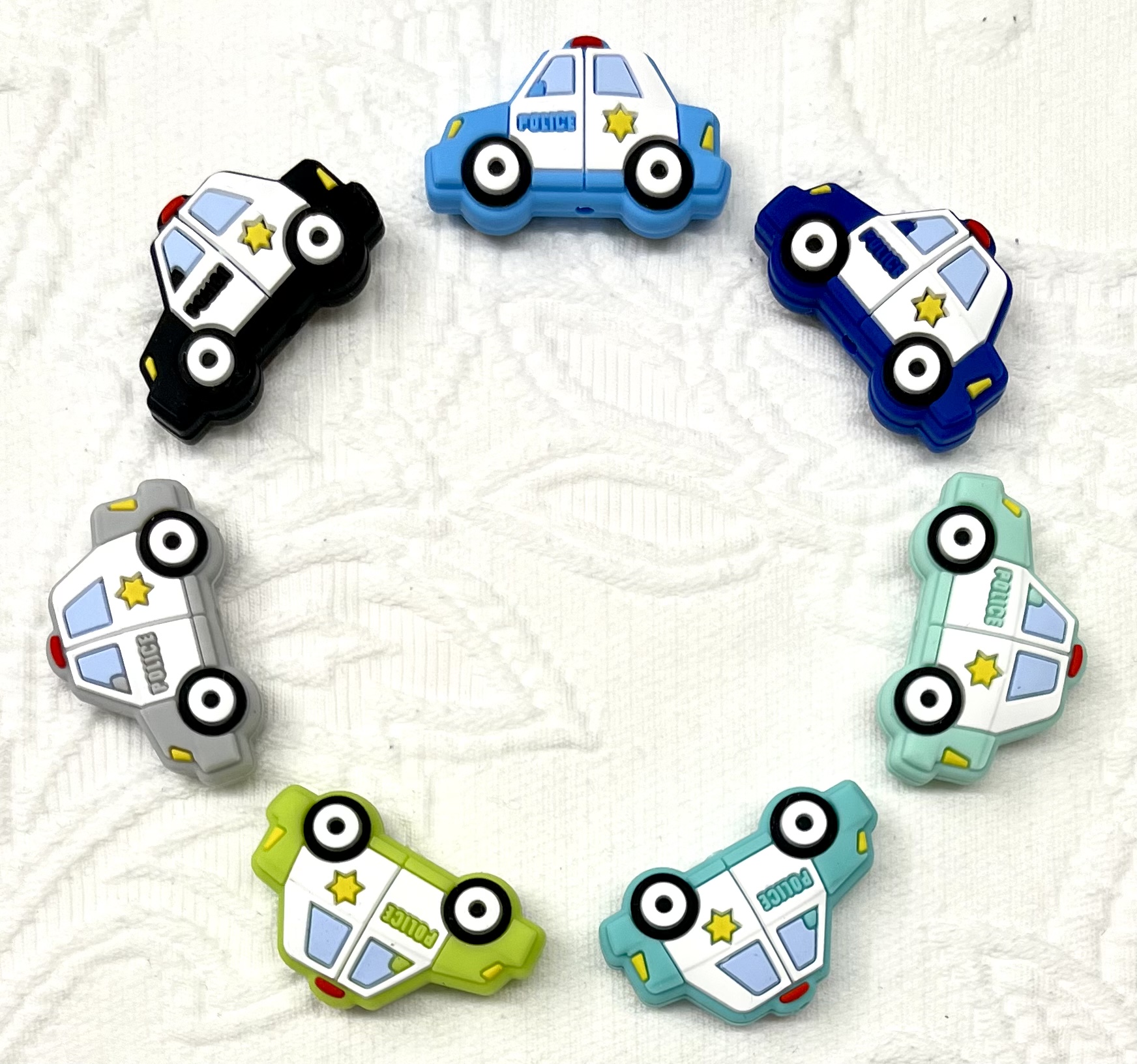 Beissmotiv Polizei Auto mehrfarbig klein, hergestellt nach der DIN EN 71-3 (Migration bestimmter Elemente)